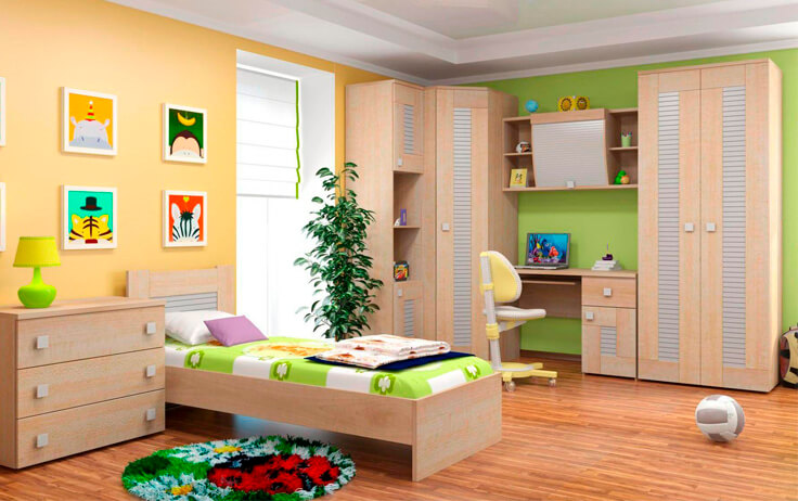 Мебельный набор должен быть «по росту» малышу. Слишком просторная кровать, высокие полки и стол не добавят радости сыну или дочери. Главное здесь — создать удобство.
