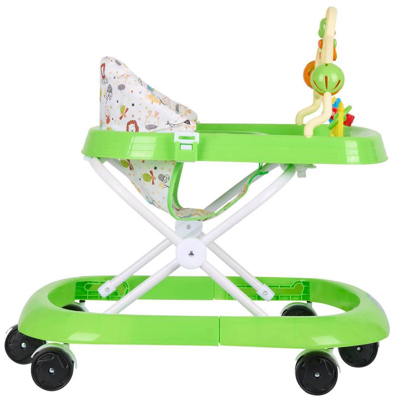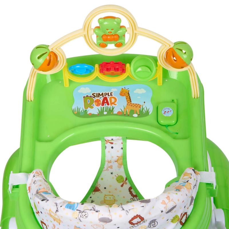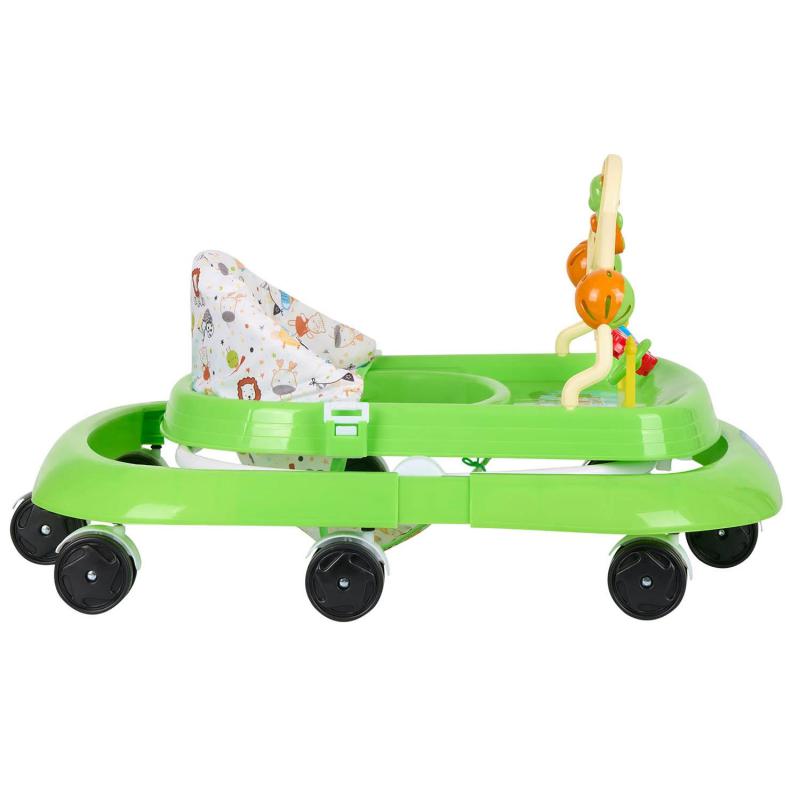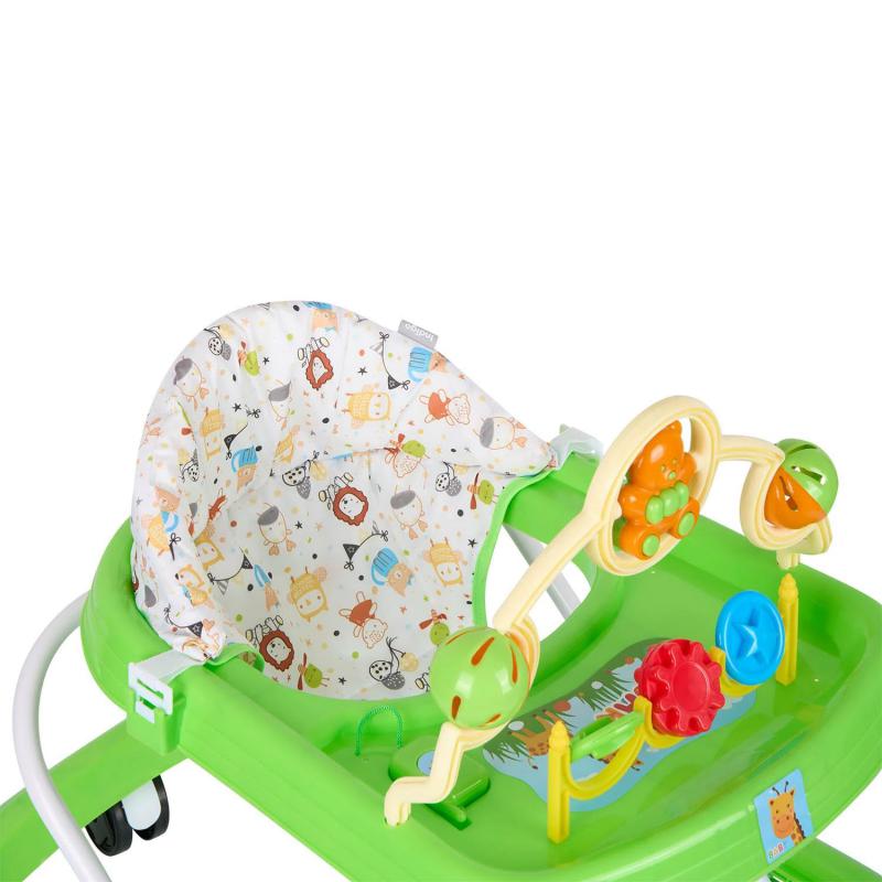 Сиденье регулируется по высоте в трех положениях. Игровая панель оснащена интерактивными элементами: игрушками-погремушками и музыкальным телефоном, что способствует развитию мелкой моторики и слухового восприятия малыша.