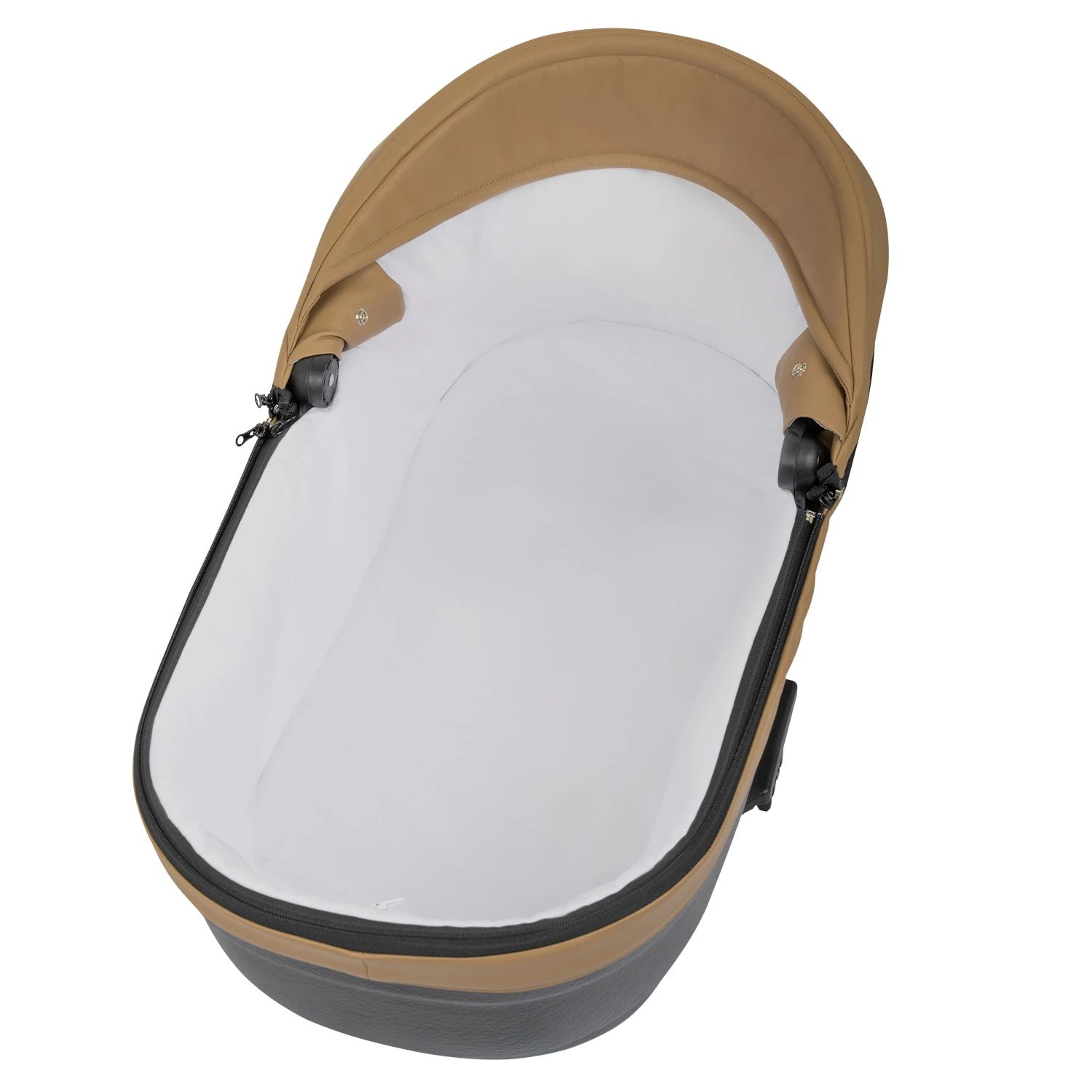 Изготовленная из высококачественной экокожи, коляска не только эстетична, но и практична, легко очищается и обеспечивает защиту от дождя и солнца.