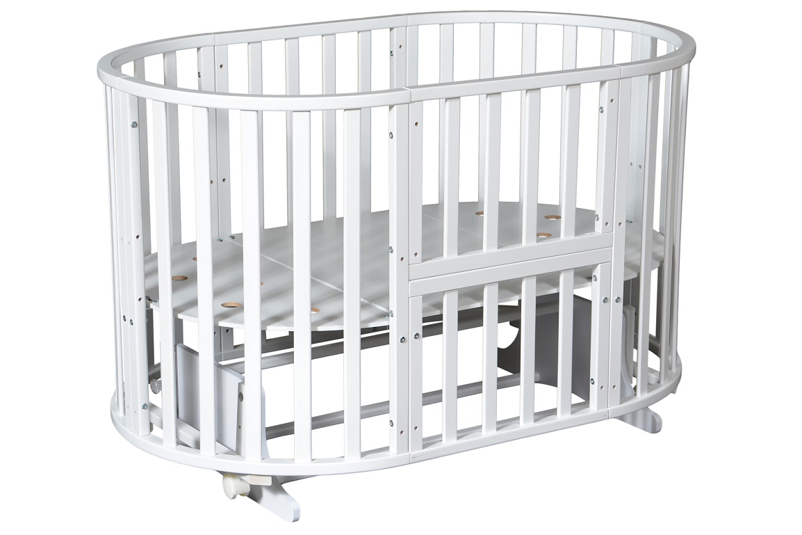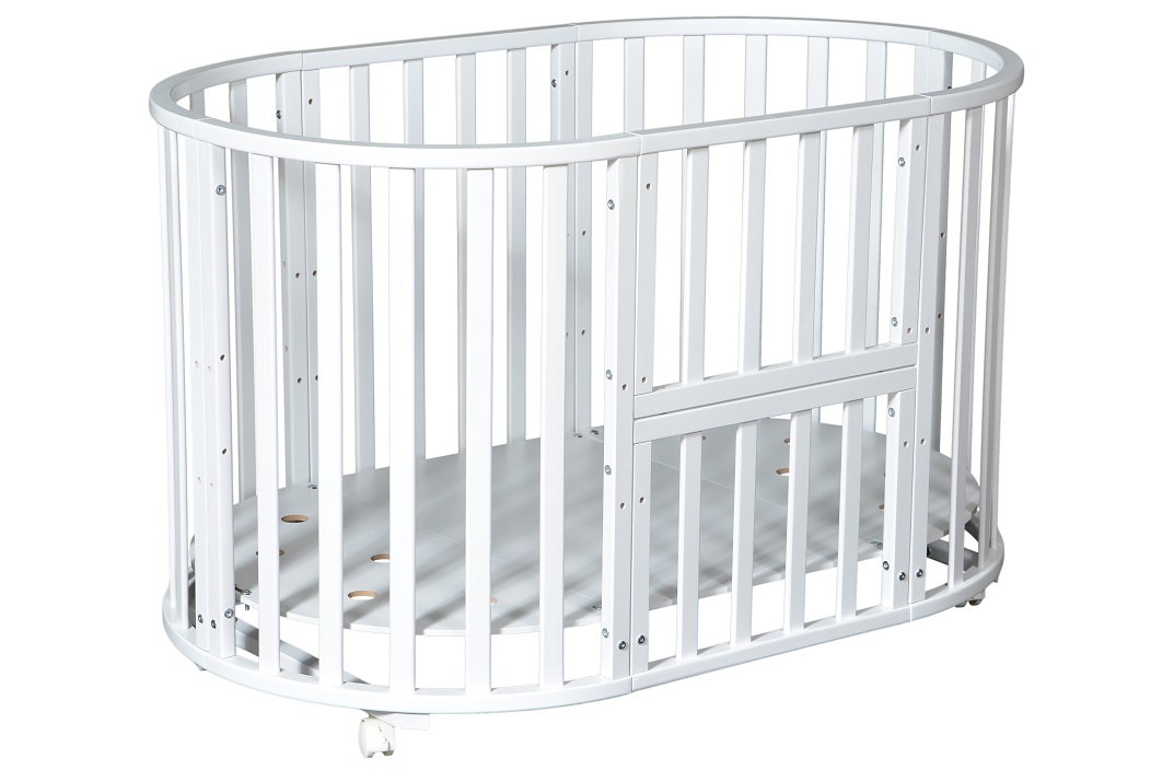 Sofia 2 Giraffe не только сочетает в себе все функции кровати Sofia 2, но еще и обладает уникальным дизайном. Вместо классической передней решетки в этой модели используется вставка с декоративной резьбой в виде Жирафа. Если кроватка будет собрана в круглом варианте, то вставка с Жирафом будет задействована в пеленальном столике. Модель адаптируется под растущего ребенка и имеет шесть вариантов трансформации: круглая кровать, овальная кровать, манеж, два стульчика, столик, диванчик Sofia 2 Giraffe укомплектована универсальным маятником, что позволяет собрать кровать с функцией как продольного так и поперечного качания. При необходимости маятниковый механизм фиксируется, либо полностью убирается. В овальной кроватке верхнюю часть решетки можно снять и тем самым обеспечить свободный доступ к ребенку. Кровать произведена из натурального дерева, детали отшлифованы и покрыты безопасным для ребенка водорастворимым лаком. В конструкции отсутствуют углы и опасные детали, регулирующие механизмы скрыты от ребенка, расстояние между ограждающими боковыми ламелями безопасно для малыша. В зависимости от назначения и возраста ребенка днище устанавливается на нескольких уровнях высоты.
