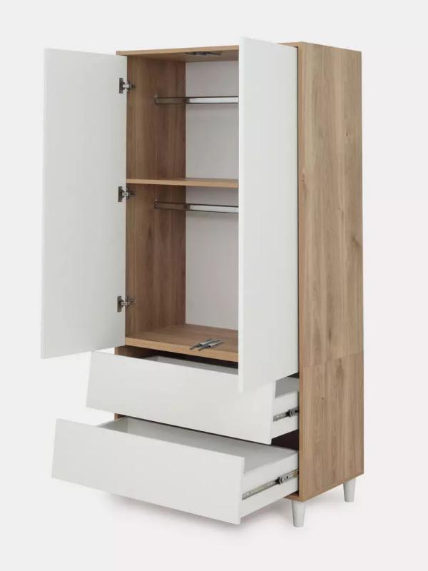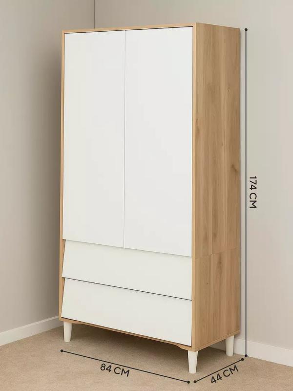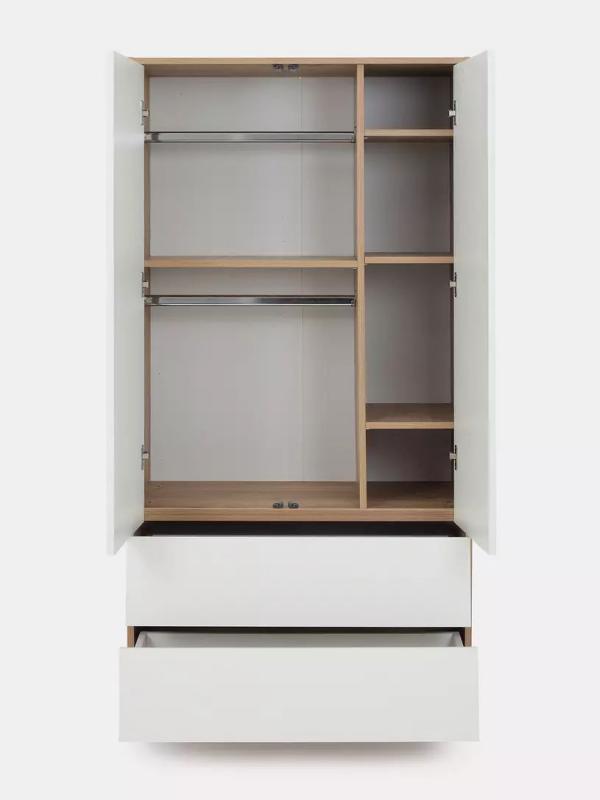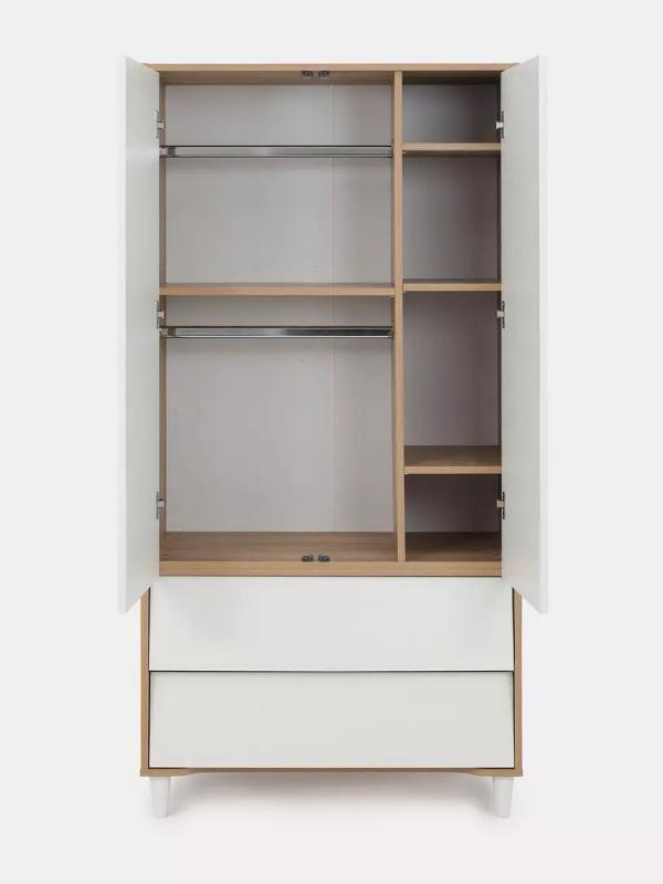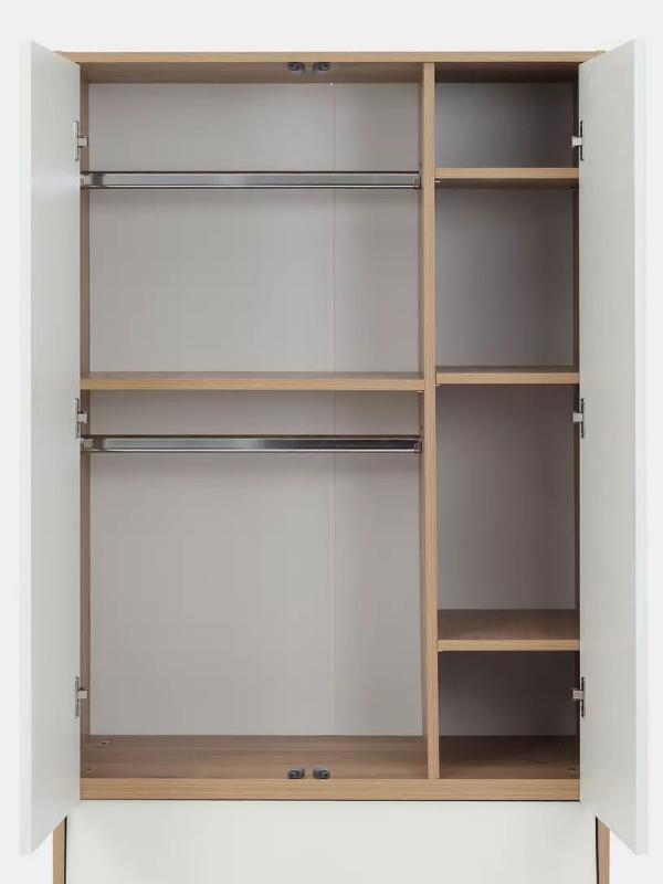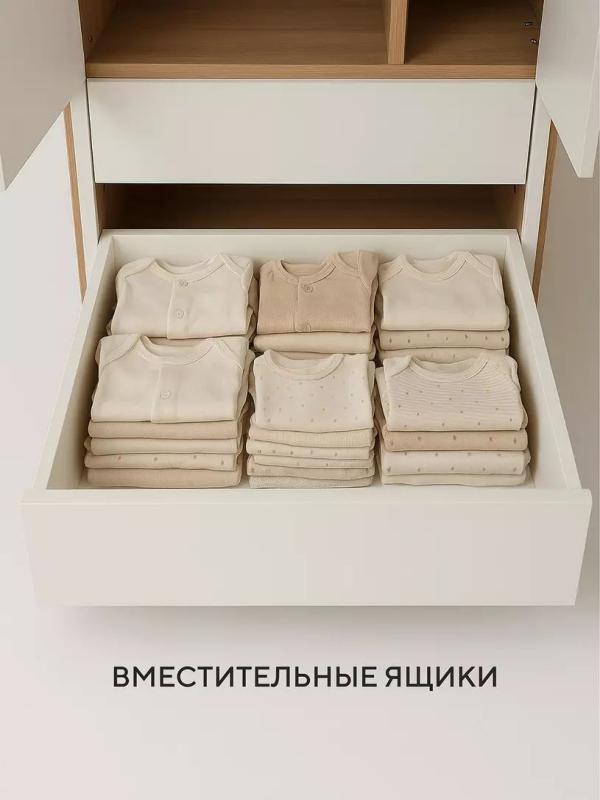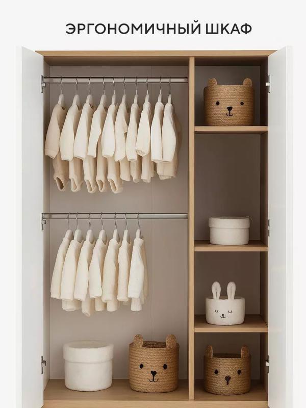 - эргономичный шкаф включает в себя все, что понадобится для хранения вещей ребенка как в настоящее время, так и в будущем: объемное отделение с двумя штангами для плечиков и полочкой (все элементы съемные); три ряда полок, расстояние между которыми можно менять на ваше усмотрение; пара вместительных выдвижных ящиков